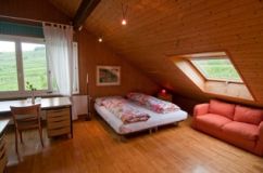 2 Zimmer („Dorfblick“ und „Bellevue“) befinden sich im Obergeschoss und haben auch alle Fernseher und eine wunderschöne Aussicht über die Rebberge und ins Dorf. Ein Bad(Dusche) und WC ist neben den Zimmern und wird von diesen gemeinsam benützt.